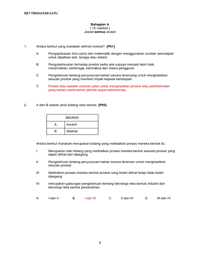 Latihan reka bentuk teknologi tingkatan 1 koleksi soalan. Bank Soalan Peperiksaan Akhir Tahun Tingkatan 1 adalah antara himpunan soalan-soalan yang berjaya kami sediakan untuk menjadi panduan dan rujukan kepada guru dan pelajar. Perkongsian bahan pembelajaran Cikgu Lida Hasim ini boleh dimanfaatkan oleh murid-murid tingkatan 1 2 dan 3 sebagai ulangkaji.